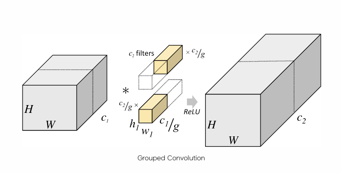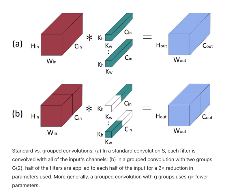 1. group 기능 : Grouped Convolution 은 입력 값 채널과 출력 채널을 여러 개의 그룹(Group인자값) 으로 나누어 독립적으로 Convolution 연산을 수행하는 방식.