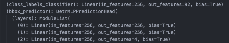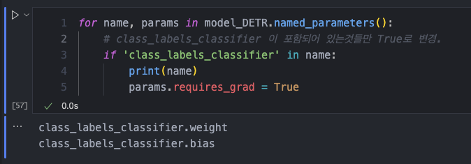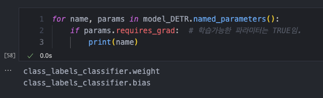 → 코드를 해석하자면 다음과 같다. DETR의 모든 파라미터를 for문을 통해 출력하는데 그중에서 'class_labels_classifier' 라는 모든 포함된 모든 파라미터들의 이름에 대해 True로 하겠다는 것이다.