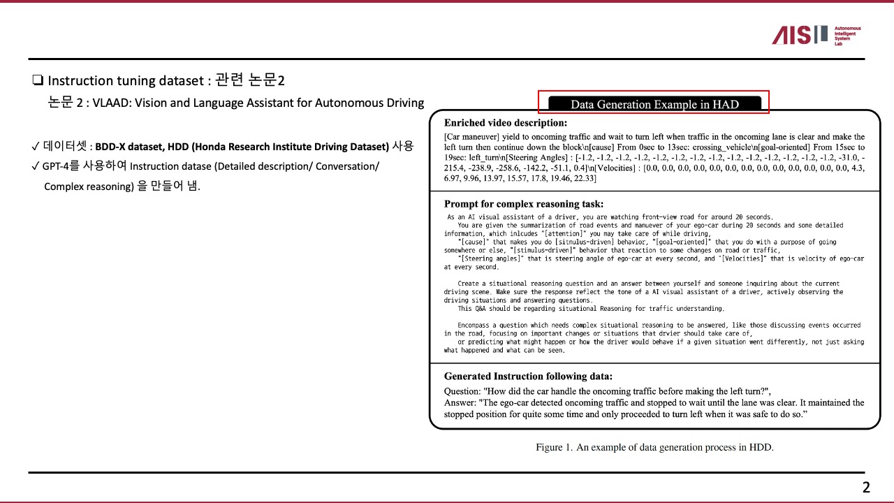 논문 리뷰 [논문리뷰: 핵심개념만] VLAAD: Vision and Language Assistant for Autonomous Driving by 애플파ol 2025. 1. 22. - 나의 개인연구에 필요한 정보만 취득하기 위해 필요부분만 정리함. 공유하기 게시글 관리 시작은 미약하였으나 , 그 끝은 창대하리라 '논문 리뷰' 카테고리의 다른 글 [논문리뷰: 핵심개념만] DRAMA: Joint Risk Localization and Captioning in Driving (1) 2025.03.04 [논문리뷰: 핵심개념만] DriveGPT4: Interpretable End-to-end Autonomous Driving via Large Language Model (0) 2025.01.10 [논문리뷰 : 서베이]. A survey on multimodal large language models (1) 2024.12.29 [논문리뷰 : 서베이] Vision-Language Models for Vision Tasks: A Survey (2) 2024.12.16 [논문리뷰: 핵심개념만] Vision GNN : An Image Is Worth Graph of Nodes (0) 2024.08.19 관련글 [논문리뷰: 핵심개념만] DRAMA: Joint Risk Localization and Captioning in Driving [논문리뷰: 핵심개념만] DriveGPT4: Interpretable End-to-end Autonomous Driving via Large Language Model [논문리뷰 : 서베이]. A survey on multimodal large language models [논문리뷰 : 서베이] Vision-Language Models for Vision Tasks: A Survey