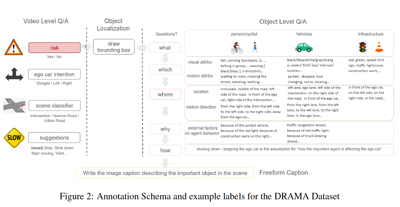 - Visual reasoning의 요소들 : querying object types (what), visual and motion attributes (which), location and motion direction (where), reasoning about risks or description of interactions (why), and effect of relationships (how).
