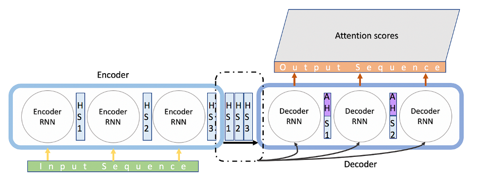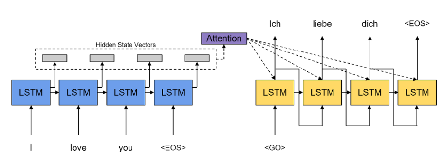 -> Seq2Seq 와는 다르게 각각의 셀에서 나온 모든 Hidden state를 활용함, Decoder 에서는 모든 Hidden state중에서 필요한 부분에 집중해서 attention(집중)활용함.
