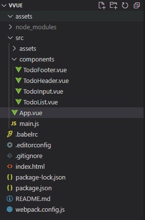 우리가 쓸 컴포넌트는 총 5개로 App.vue/TodoFooter.vue/TodoHeader.vue/TodoInput.vue/TodoList.vue 이다.