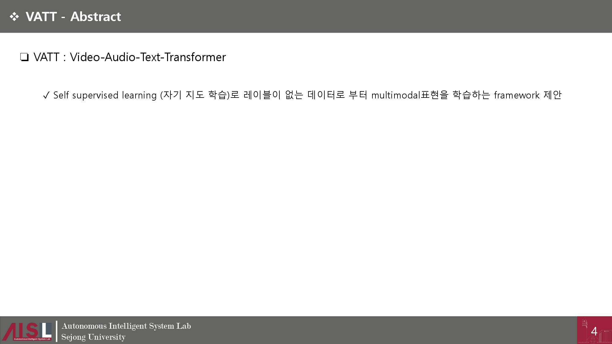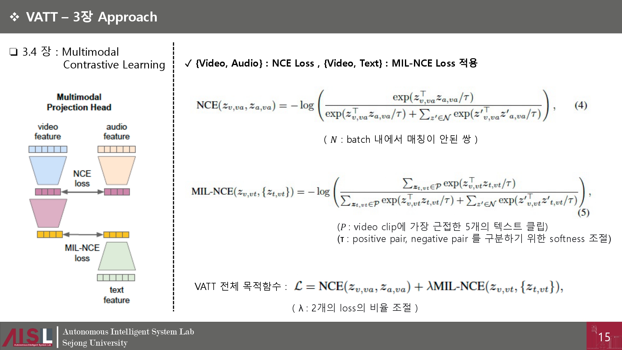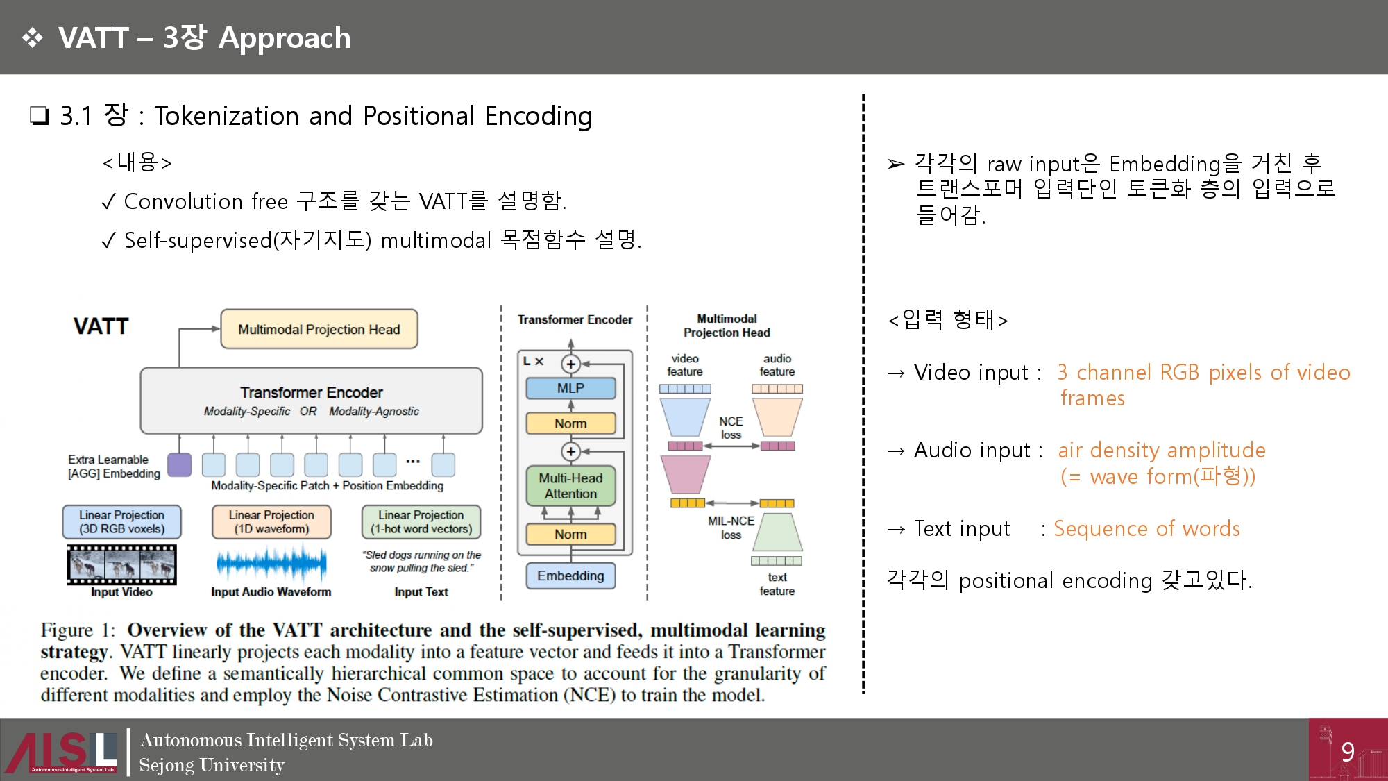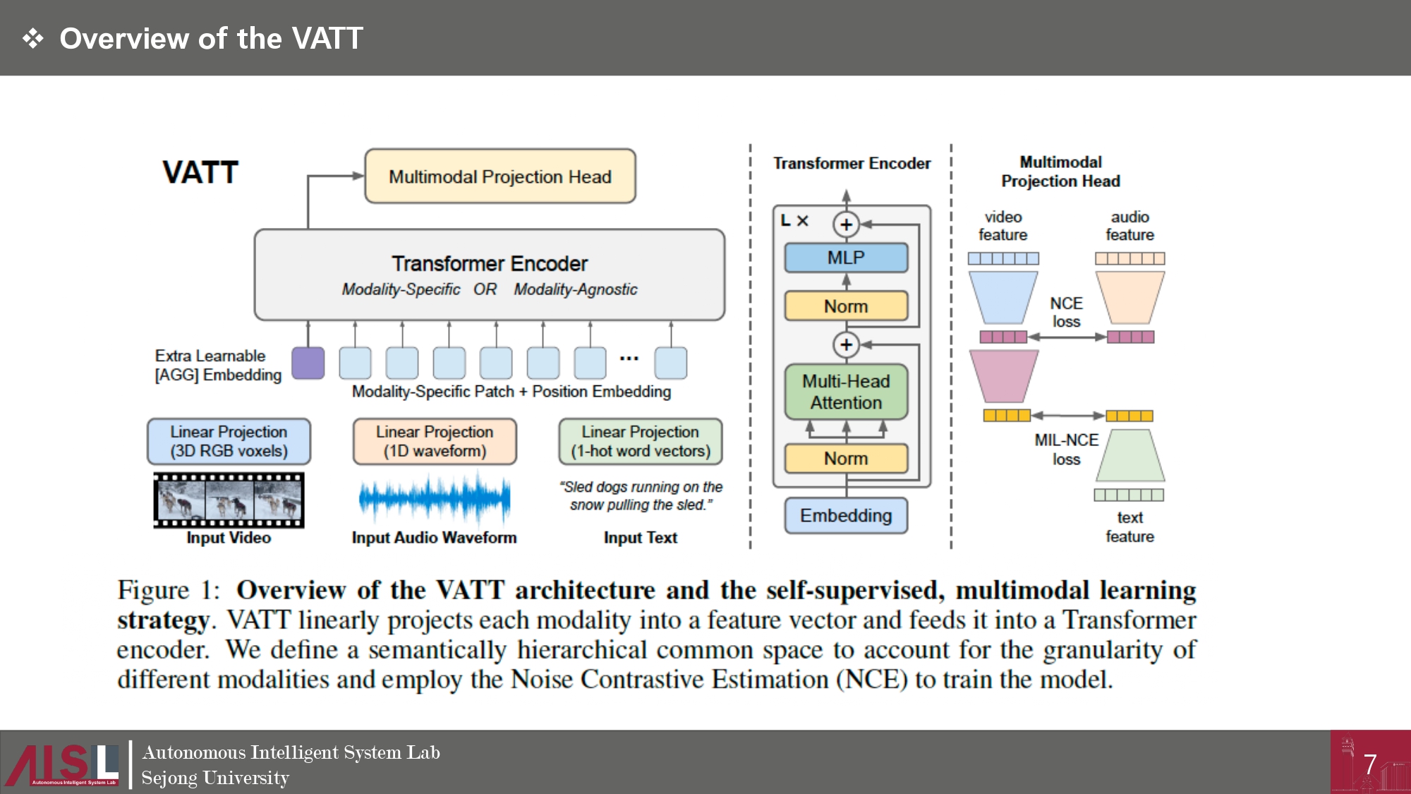 논문 리뷰 [논문리뷰 : 개념] VATT : Transformers for Multimodal Self-Supervised Learning From Raw Video, Audio and Text by 애플파ol 2023. 9. 10. 공유하기 게시글 관리 시작은 미약하였으나 , 그 끝은 창대하리라 '논문 리뷰' 카테고리의 다른 글 [논문리뷰 : 개념] In-flight positional and energy use data set of a DJI Matrice 100quadcopter for small package delivery (0) 2024.01.02 [논문리뷰 : 개념] CapERA: Captioning Events in Aerial Videos (0) 2023.12.06 [논문 리뷰 : 서베이] Multimodal Learning With Transformers: A Survey (0) 2023.11.11 [논문리뷰 : 코드] Swin Transformer : Hierarchical Vision Transformer using Shifted Windows (1) 2023.11.06 [논문리뷰 : 개념] Swin Transformer : Hierarchical Vision Transformer using Shifted Windows (0) 2023.10.30 관련글 [논문리뷰 : 개념] CapERA: Captioning Events in Aerial Videos [논문 리뷰 : 서베이] Multimodal Learning With Transformers: A Survey [논문리뷰 : 코드] Swin Transformer : Hierarchical Vision Transformer using Shifted Windows [논문리뷰 : 개념] Swin Transformer : Hierarchical Vision Transformer using Shifted Windows