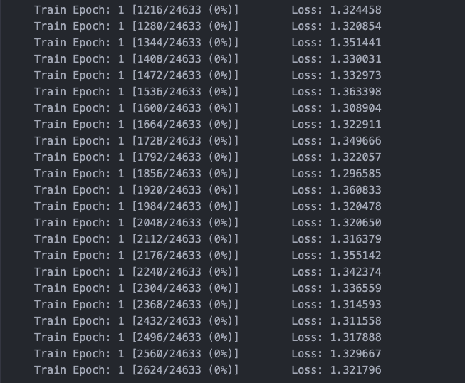 → 유용한 팁. 만약 학습이 잘되는지 확인을 하고싶다면 tqdm을 사용하면 최소 2번이상은 되어야 학습이 잘되는지 loss값 감소를 통해 확인 할 수 있다. (물론 wandb 사용 안할때) 초반에 학습이 잘되는지 확인하고 싶다면 아래코드에서 tqdm을 빼버리고 주석처리된 부분을 살리면, 설정한 log_interval 간격으로 배치 사이즈 마다 출력이 실시간으로 출력된다. 그렇다보니. 미니배치 마다 loss값이 줄어들고 있다면 알맞게 코드를 작성했다고 1epoch가 끝나기 전에 확인이 가능하다.
